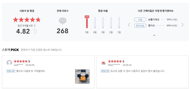 전기 없이 작동하면서도 야외청소 효율은 정말 만족스럽다는 평을 받는 장비죠.