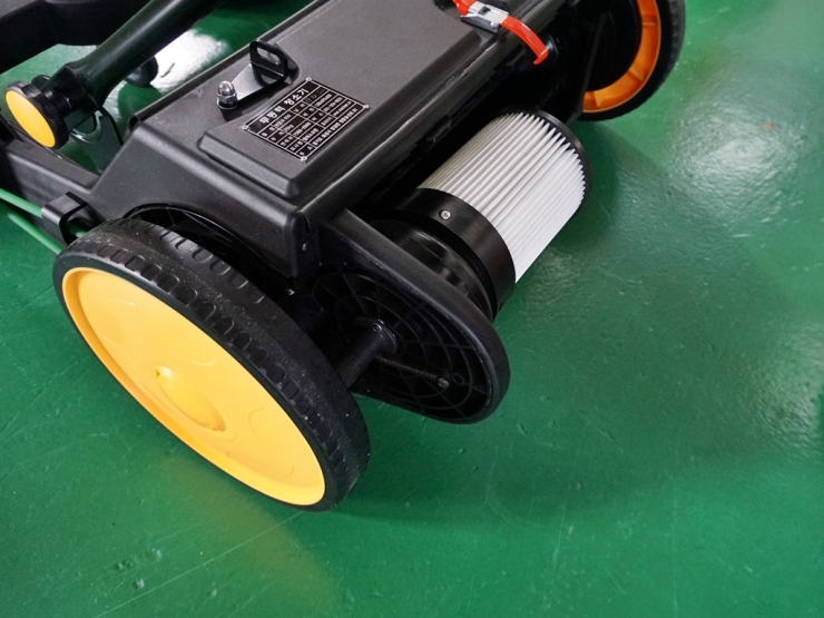 사용자가 밀면 바퀴와 연동된 원통형 메인 브러시가 회전해 바닥의 분진이나 쇳가루, 톱밥, 흙먼지를 쓸어 담습니다.