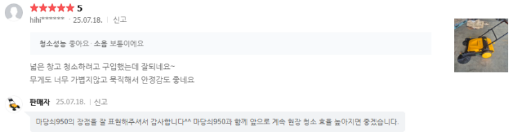 특히 무동력청소기 판매 업체들 대부분은 A/S가 잘 이루어지지 않는 경우가 많은데 크린만물상은 판매 이후에도 A/S가 잘되는 덕분에 이 점에서 만족도가 높습니다