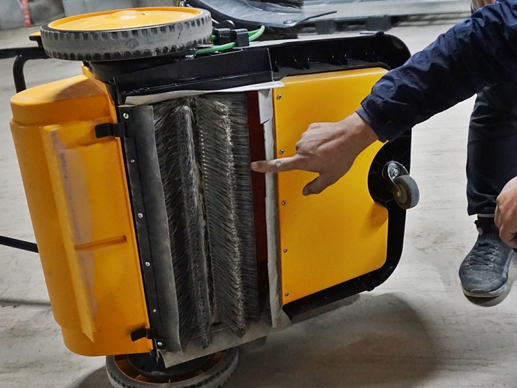 사용자가 밀기만 하면 바퀴와 연동된 원통형 메인 브러시가 계속 회전하면서 바닥의 먼지와 이물질을 노란색 45L 호퍼통으로 쓸어 담는 방식입니다