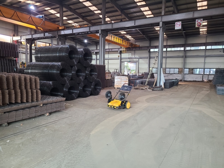 바닥은 콘크리트 산업용 바닥으로 보이며 지게차 이동 흔적과 함께 미세한 분진이 넓게 퍼져 있는 상태였습니다. 철근 절단과 이동 과정에서 생기는 철 분진과 외부에서 유입된 흙먼지가 함께 섞여 있었고, 바닥을 걸을 때마다 미세한 먼지가 다시 떠오르는 상황이었습니다.