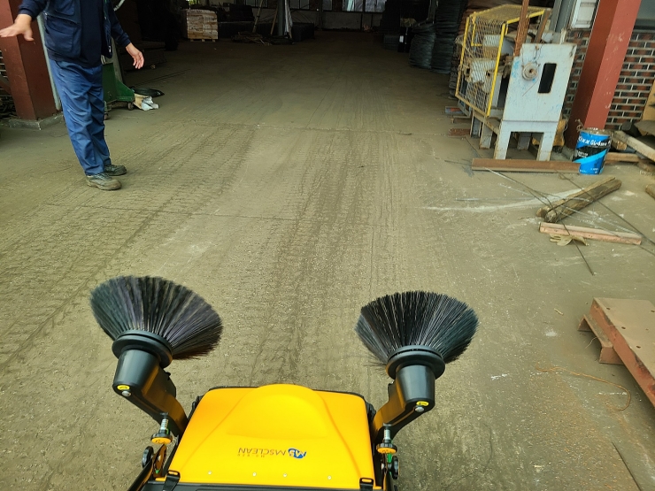 넓은 공장 바닥을 빗자루로 정리하려면 여러 명이 동시에 움직여야 합니다. 하지만 마당쇠950 같은 장비를 사용하면 한 사람이 넓은 구역을 빠르게 정리할 수 있습니다.