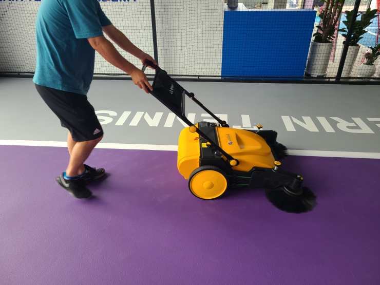 실내 테니스장은 공에서 발생하는 미세한 털 먼지와 바닥에 쌓이는 분진이 지속적으로 발생하는 구조인데, 일반 빗자루로 작업할 경우 먼지가 날리면서 오히려 관리가 더 어려워지는 경우가 많습니다.